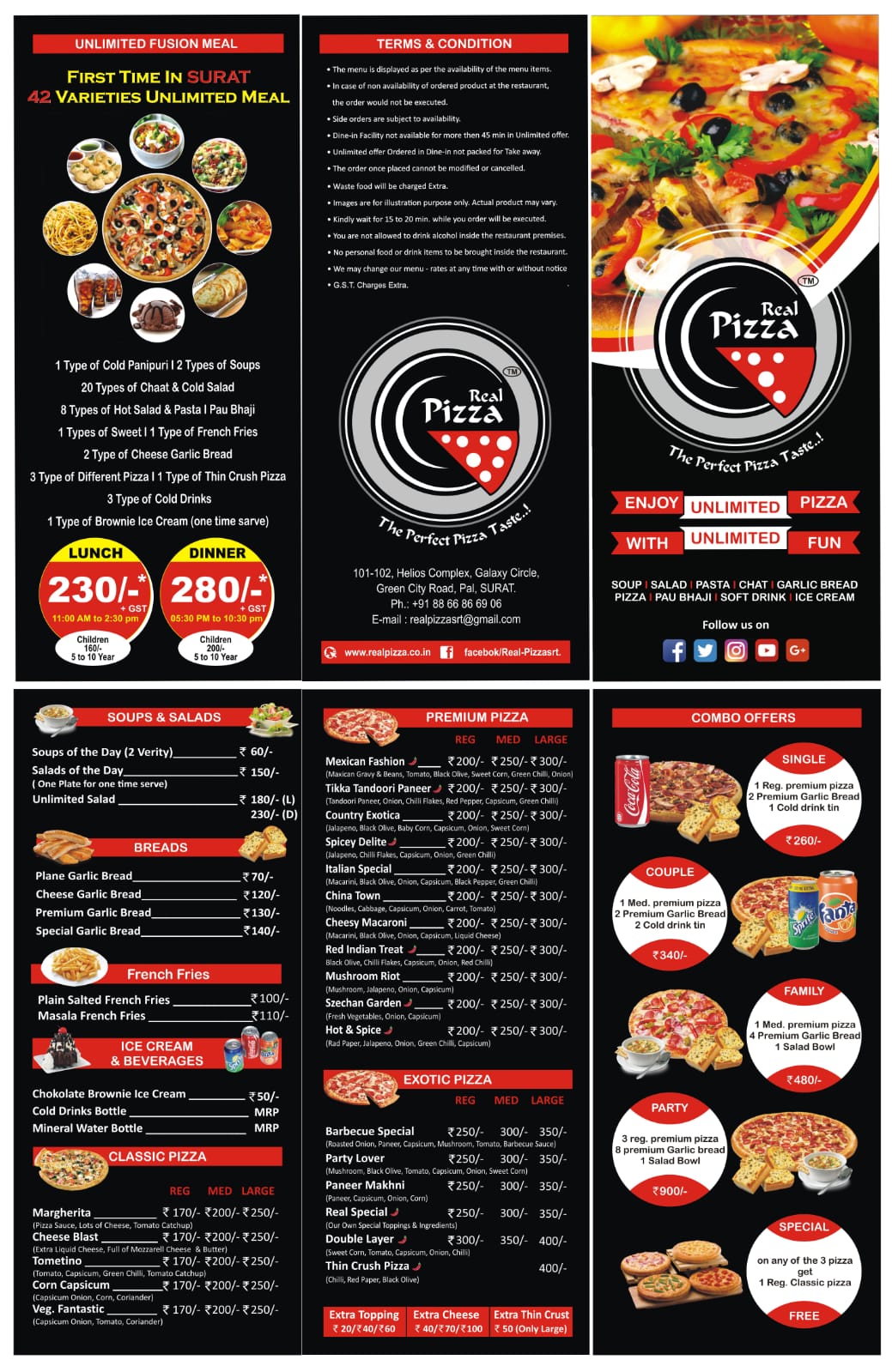 Our sole motto at Real Pizza is to provide a real taste of pizza. With our ’Soup to Dessert’ unlimited meal, we try to serve different items to different people with different taste buds. Our large variety of food items and our affordability makes us people’s favourite Pizza Hub.